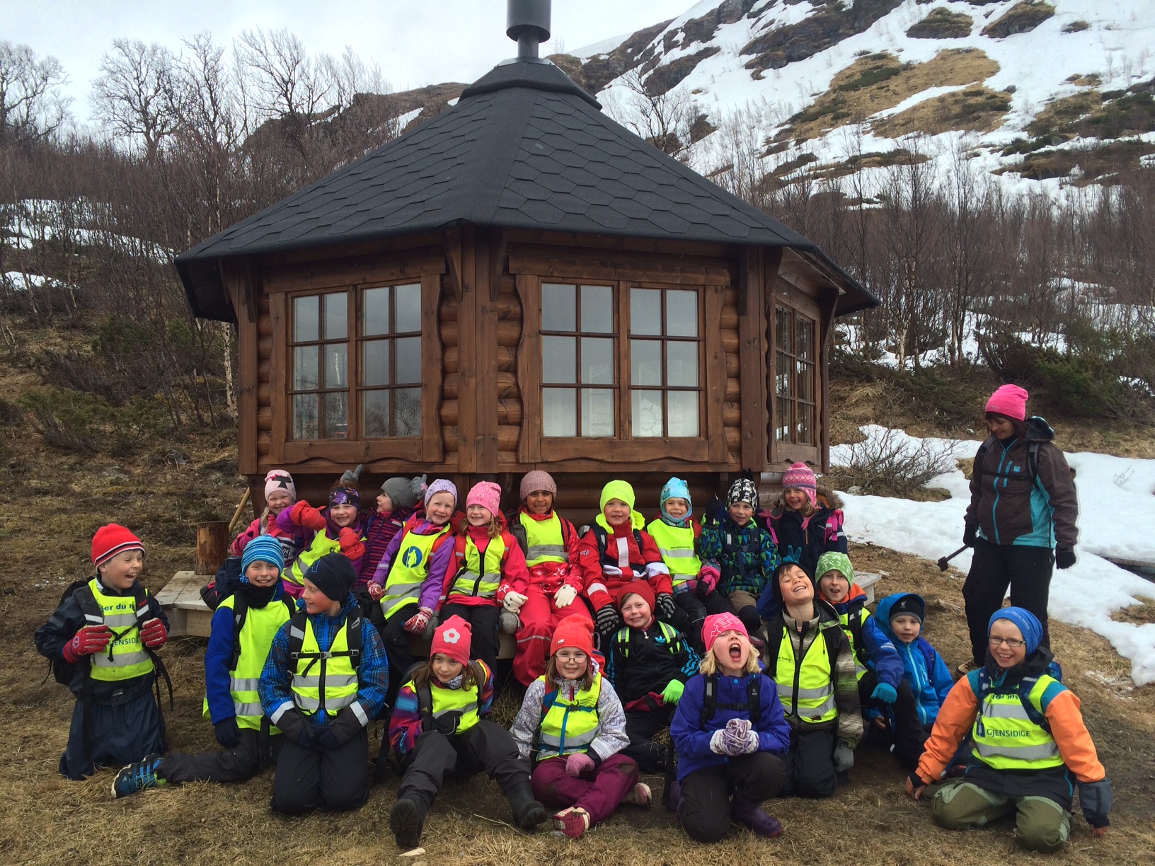 Da har «Uteskolen» ved Grov Skole (1.-4. klasse) vært på årets første 10-på-topp tur. Vi gikk opp til grillbua i Vakkerstadlia. Det var litt snø den siste biten frem, men snøen var så hardpakket, at den bar både store og små. Alle elevene vil gjerne rette en kjempetakk til de som var med å sette opp denne grillbua. Med litt godvilje og stram organisering av sekker og elever,så fikk 21 elever + 4 voksne plass i bua! Det var godt å sitte inne og spise matpakken, da det var surt og kaldt ute. Det kom faktisk noen snøfnugg mens vi var der.